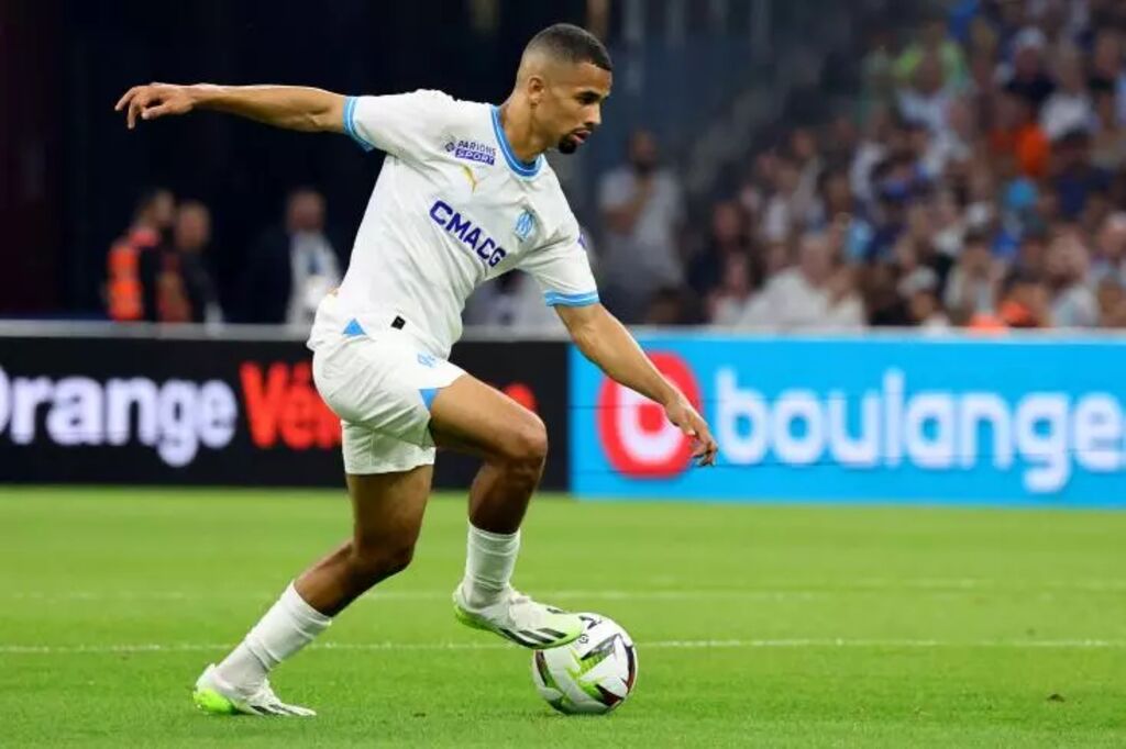 | L'attaquant sénégalais de l'OM, Iliman Ndiaye, contre Leverkusen en amical, le 2 août au stade Vélodrome. |