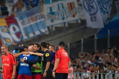 | Les joueurs de Caen se congratulent après le but d'Andy Delort contre Marseille, le 8 août au Vélodrome. |