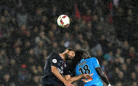 | "Classique" au Parc des Princes, le 23 octobre 2016, choc entre Thiago Motta et le Marseillais, Bafétimbi Gomis. |