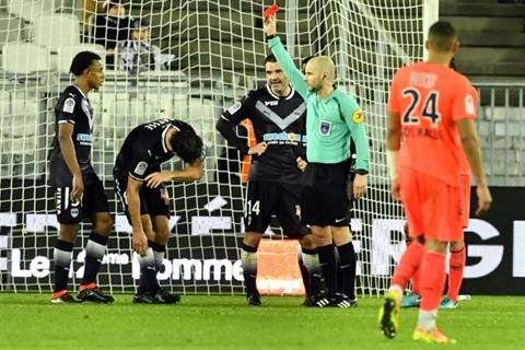 | Le défenseur de Bordeaux Paul Baysse est exclu contre Caen, le 16 janvier à Bordeaux. |