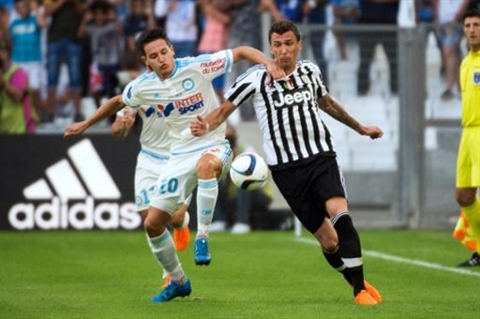 | Le milieu de l'OM Florian Thauvin (gauche) à la lutte avec le joueur de la Juventus Turin, Mario Mandzukic, en match amical, à Marseille le 1er août. |