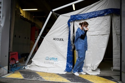 | Un membre du personnel soignant ajuste son masque de protection avant d'entrer dans une tente médicalisée dressée dans la cour de l'hôpital Henri Mondor, le 6 mars à Créteil |