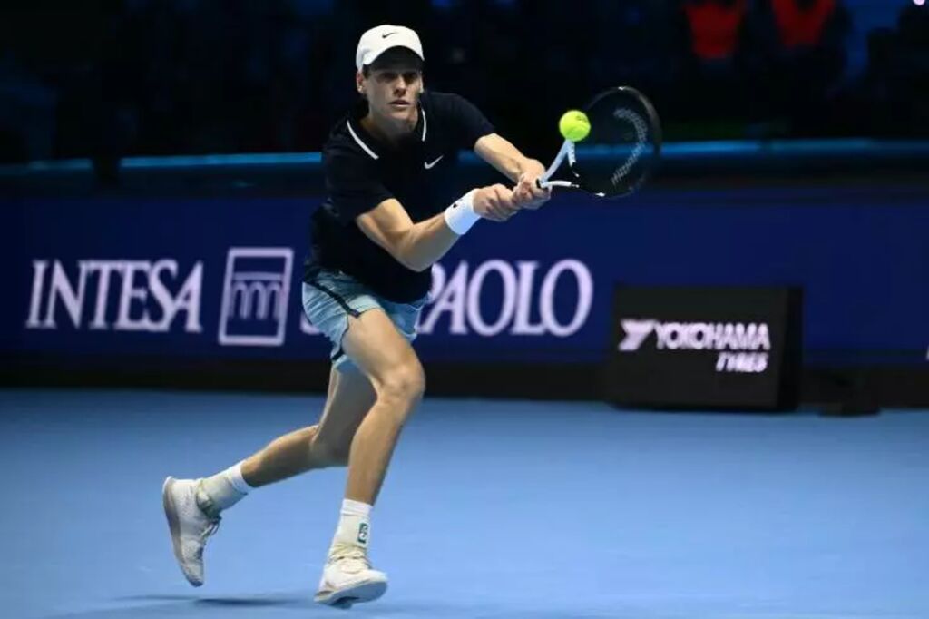 | Jannik Sinner frappe un revers en finale des Masters ATP face à l'Américain Taylor Fritz, à Turin, le 17 novembre. |