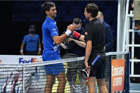 Les quatre premières têtes de série réunies dans le dernier carré pour la première fois depuis 2004, ont offert deux demies pleines d'intensité et de suspens pour la dernière édition londonienne du Masters, malgré le huis-clos et l'ambiance aseptisée. C'est d'abord Thiem qui a livré un combat titanesque de presque trois heures avec Novak Djokovic 7-5, 6-7 (10/12), 7-6 (7/5).