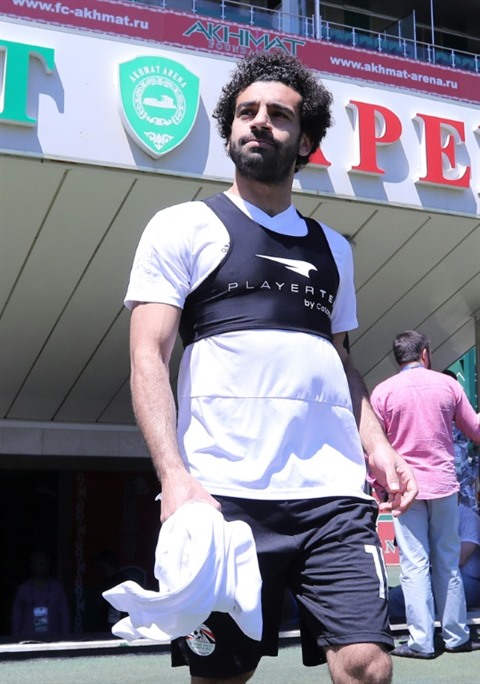 | L'attaquant vedette de l'équipe d'Égypte, Mohamed Salah, à l'entraînement le 13 juin à Grozny. |