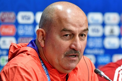 | Le sélectionneur de l'équipe de Russie, Stanislav Cherchesov, en conférence de presse à la veille du match d'ouverture contre l'Arabie Saoudite, le 13 juin à Moscou. |