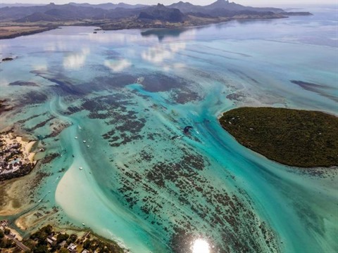 | Vue du ciel de la marée noire sur les côtes de l'île Maurice, menacées par la nappe de carburant qui s'écoule du vraquier Wakashio, le 8 août. |