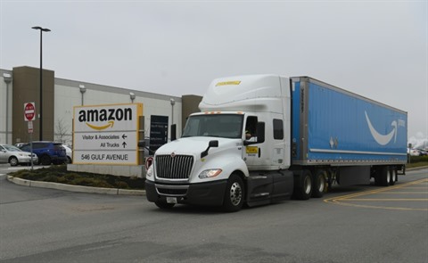 | Un camion Amazon sur le site de Staten Island, le 30 mars à New York. |