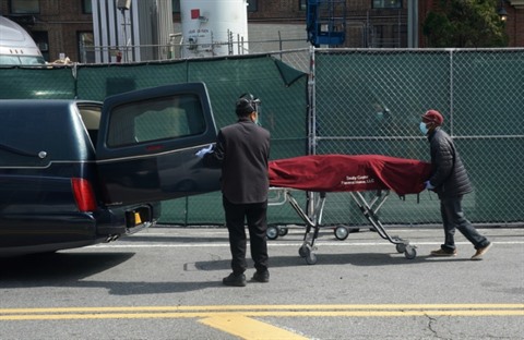 | Des employés des pompes funèbres emmènent le corps d'une victime du COVID-19, le 8 avril à New York. |
