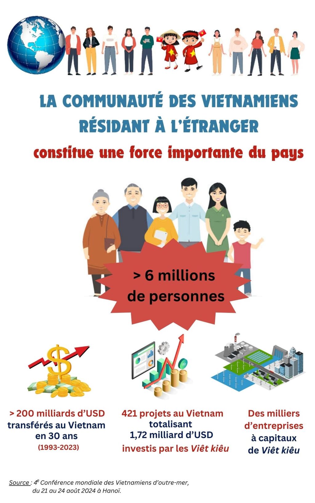 Bien que vivant éloignés de la Patrie, ils ne cessent de cultiver, de valoriser le patriotisme et la fierté nationale, de préserver les traditions culturelles vietnamiennes, d’avoir le regard tourné vers leurs origines et d’entretenir des rapports étroits avec leur famille et la mère patrie. Ils ont investi dans 42 des 63 villes et provinces du pays jusqu’en novembre 2023 avec 421 projets d’un fonds total enregistré à 1,72 milliard d’USD.