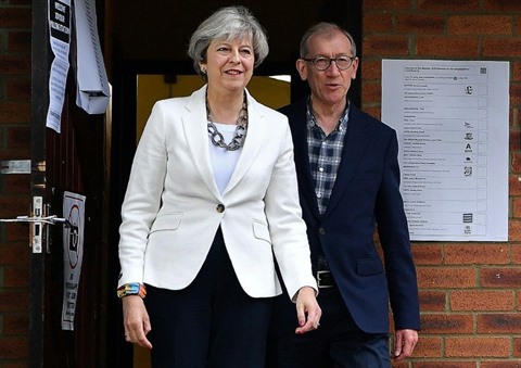 | La Première ministre britannique Theresa May et son époux Philip quittent leur bureau de vote à Sonning, à l'ouest de Londres le 8 juin. |
