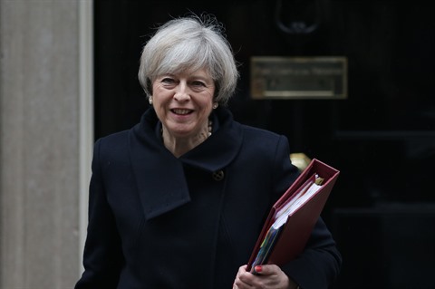 | La Première ministre britannique Theresa May, le 1er février 2017 à la sortie du 10 Downing street à Londres. |