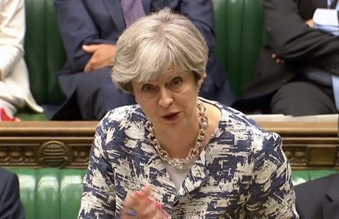 | Capture d'écran à partir d'une vidéo de la chaîne parlementaire britannique (PRU) qui montre la Première ministre Theresa May le 26 juin au parlement à Londres. |