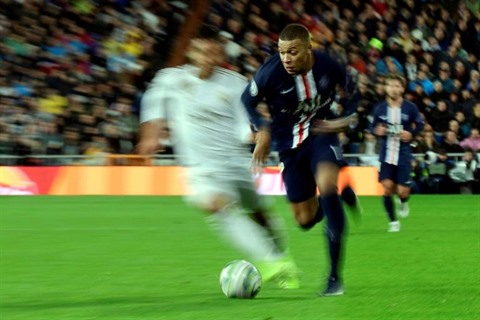 | Kylian Mbappé déborde un joueur du Real lors du match nul 2-2 avec Paris SG à Madrid en Ligue des champions. |