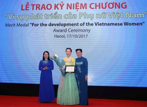 | Lors de la remise de la médaille «Pour le développement des femmes vietnamiennes» à la présidente de l'Association mondiale des femmes d’affaires, Han Mi Young (centre), le 17 octobre à Hanoï. |
