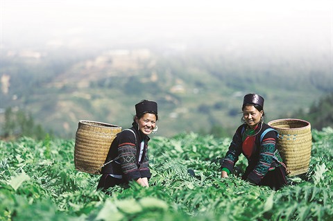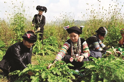 | Des femmes H’mông récoltent des plantes d’artichaut. |