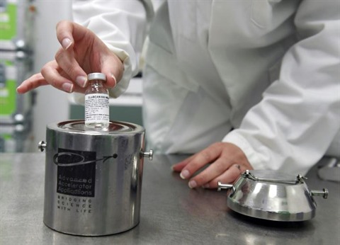 | Une dose de Gluscan, un sucre associé à un fluor radioactif produit par le laboratoire AAA et présenté le 11 octobre à Saint-Genis-Pouilly, sur son site de production. |