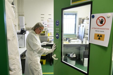 | Un pharmacien en activité dans le laboratoire AAA spécialisé en médecine nucléaire, le 11 octobre, à Saint-Genis-Pouilly (Est de la France). |