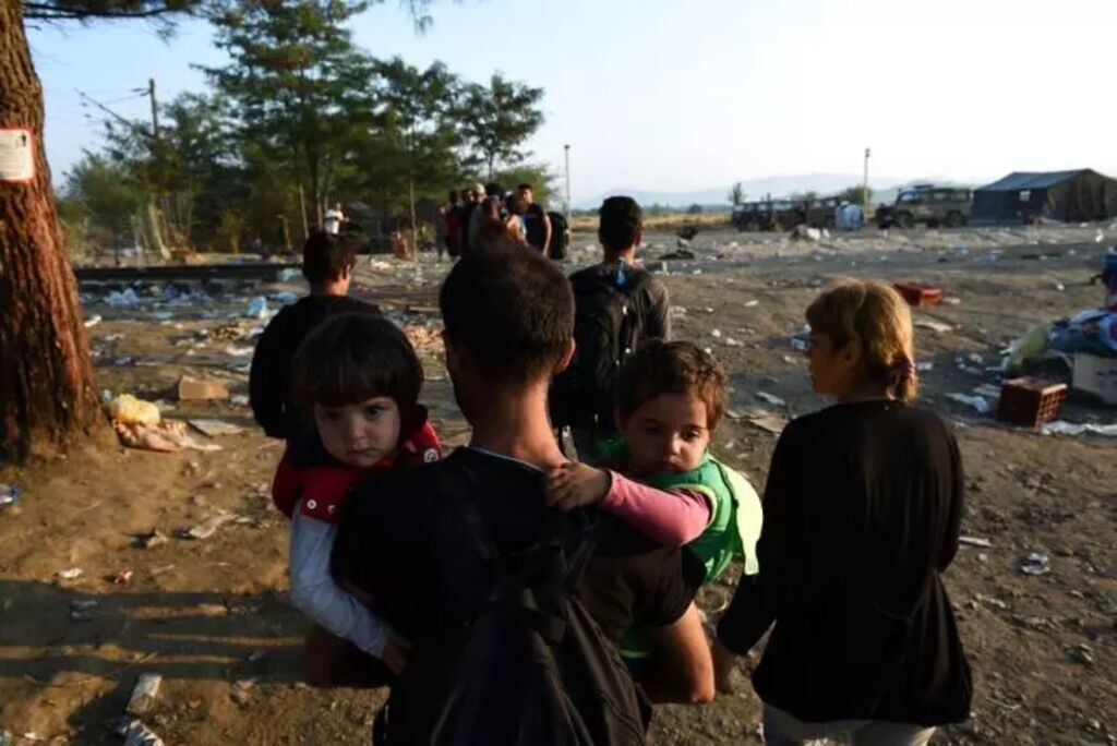 | Un homme porte deux enfants en attendant de traverser la frontière entre la Grèce et la Macédoine, le 1er septembre 2015. |
