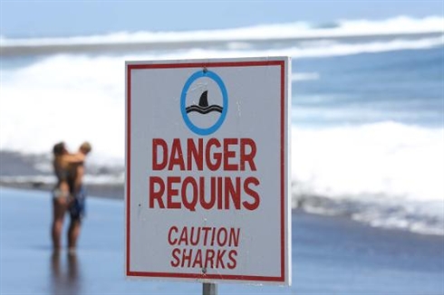 | Une affiche pour mettre en garde contre les requins sur une plage de La Réunion, le 27 octobre 2013. |