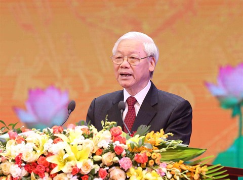 | Le secrétaire général du Parti communiste du Vietnam Nguyên Phu Trong prend la parole lors du meeting. |