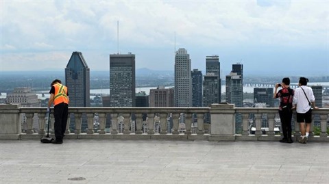 | Des gens se tiennent sur le belvèdére du Mont-Royal à Montréal (Canada) le 29 juillet. |
