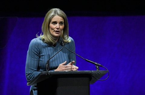 | La directrice de la distribution de Disney, Cathleen Taff, sur la scène du CinemaCon à Las Vegas le 3 avril. |