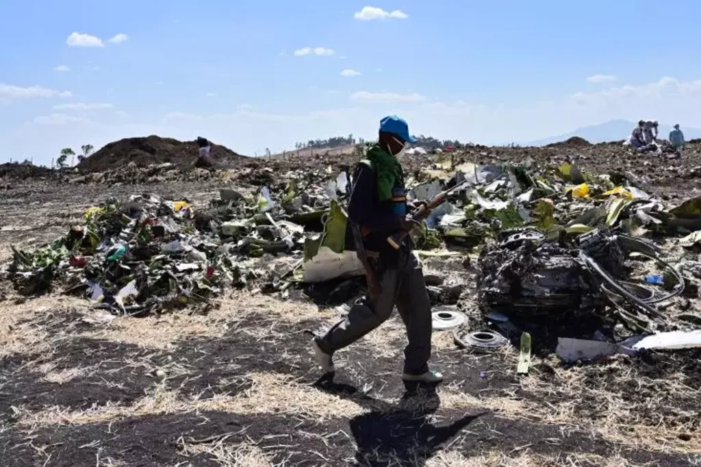 | Sur le site du crash d'un Boeing 737 MAX 8 d'Ethiopian Airways, le 16 mars 2019 près de Bishoftu (Éthiopie). |