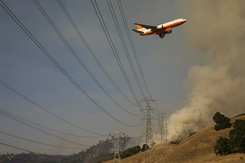 | Un avion bombardier d'eau survole les flammes de l'incendie du "Kincade Fire", en Californie, le 26 octobre. |