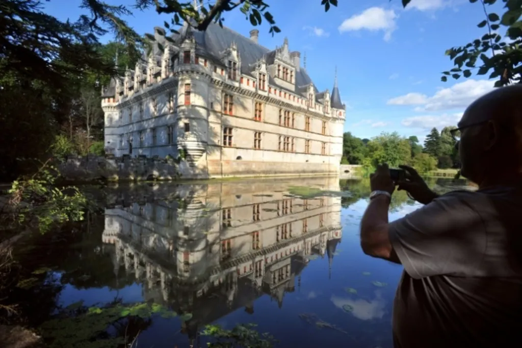 | Un touriste visitant le château d'Azay-le-Rideau, en Indre-et-Loire. |