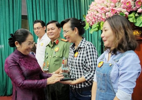 | La secrétaire adjointe du Comité du Parti de Hô Chi Minh-Ville, Vo Thi Dung (gauche), remet le satisfecit aux collectifs. |