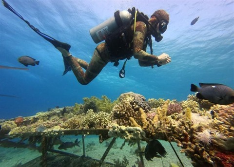 | Un plongeur de l'Autorité de proctection de la vie sauvage en Israël dans les eaux d'Eilat pour sauver des coraux, le 20 mai. |
