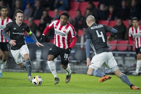 | L'ailier néerlandais du PSV Eindhoven, Steven Bergwijn (centre), lors du match de groupes de la Ligue des champions face à Rosenborg, à Eindhoven, le 12 décembre 2019. |