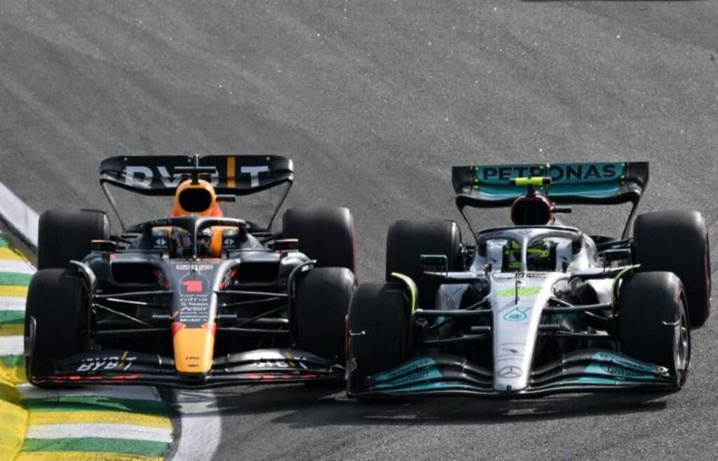 | Max Verstappen et sa Red Bull(à gauche) et Lewis Hamilton avec sa Mercedes au contact lors du Grand Prix du Brésil sur le circuit d'Interlagos à Sao Paulo le 13 novembre. |