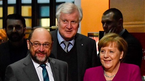 | La chancelière allemande Angela Merkel (droite), le leader du SPD, Martin Schulz (gauche), et le bavarois conservateur (CSU), Horst Seehofer, dans les quartiers généraux du SPD, le 2 février à Berlin. |