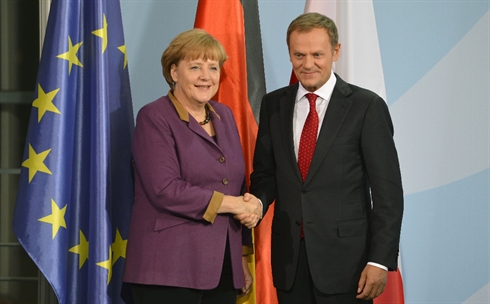 | La chancelière allemande Angela Merkel et le Premier ministre polonais Donald Tusk, le 14 novembre à Berlin. |