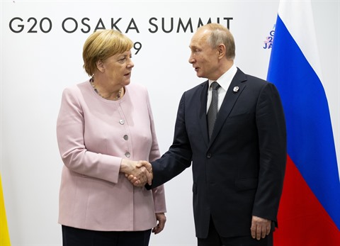 | La chancelière allemande Angela Merkel et le président russe Vladimir Poutine le 29 juin au Japon. |