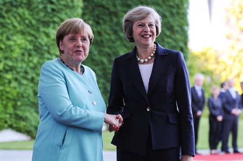 | La Première ministre britannique Theresa May (droite) et la chancelière allemande Angela Merkel, le 20 juillet à Berlin. |