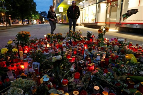 | Des bougies et des fleurs déposées autour de la photo d'un Allemand poignardé à mort à Chemnitz, sur un mémorial improvisé dans une rue de la ville le 30 août. |