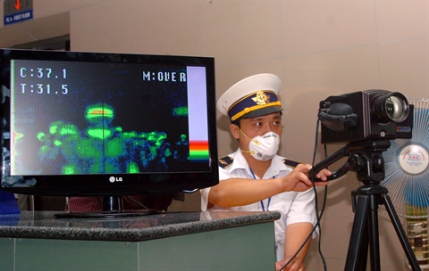 | Contrôle de la température corporelle à l'aéroport international de Nôi Bài, Hanoi. |