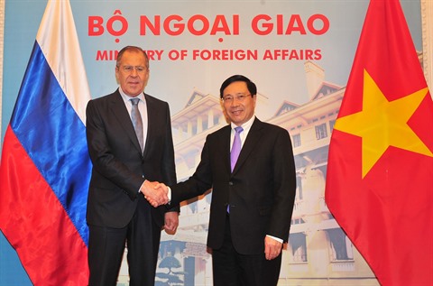 | Le vice-PM et ministre des AE, Pham Binh Minh (à droite), et le ministre russe des AE, Sergueï Lavrov, lors de sa visite à Hanoï, le 23 mars. |