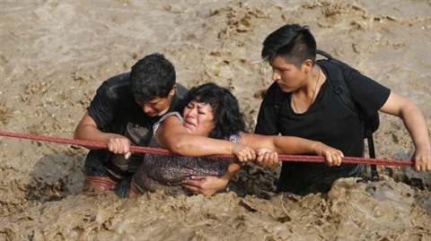 | Deux personnes aident une femme à traverser une rue inondée après le débordement d'une rivière à Huachipa, au Pérou. |