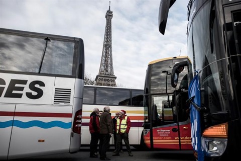 | Des conducteurs d'autocars bloquent les environs de la Tour Eiffel, le 20 décembre à Paris. |