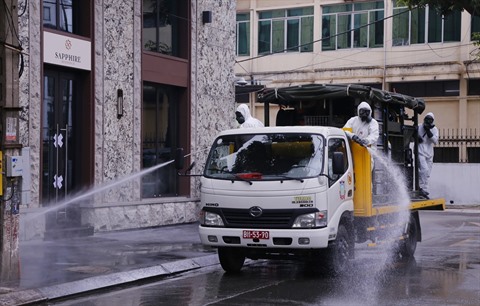 | Désinfection dans la rue Trúc Bach, à Hanoï. |