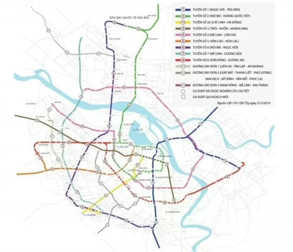 Actuellement, seule la ligne Cat Linh - Hà Dông, longue de 13 km, est en exploitation commerciale après dix ans de travaux, tandis que la ligne Nhôn - gare de Hanoï, avec ses 4 km souterrains, devrait être achevée d'ici 2027. La construction des huit autres lignes n'a pas encore commencé.