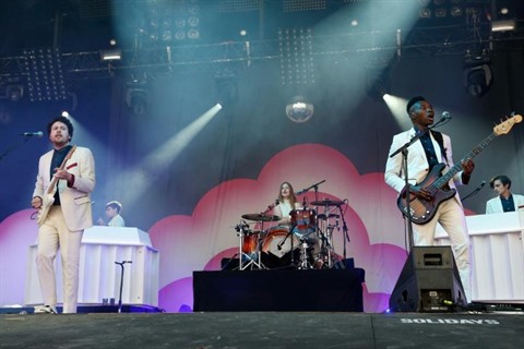 | Metronomy avec Joseph Mount, chanteur et guitariste, Anna Prior, batteur, et Olugbenga Adelekan, bassiste, lors du festival de musique Solidays à Paris. |