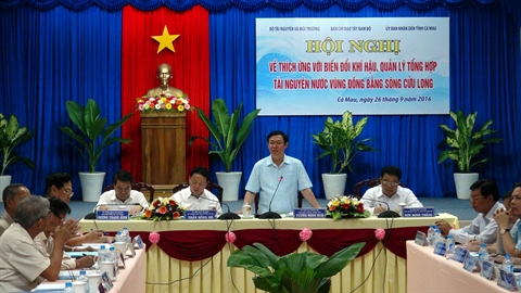 | Le vice-Premier ministre Vuong Dinh Huê (debout) lors d'une conférence sur l’adaptation au changement climatique, le 26 septembre à Cà Mau (Sud). |