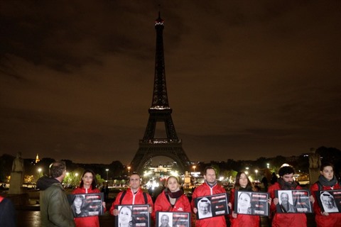 | Des gens portent les portraits de journalistes assassinés devant la Tour Eiffel, éteinte une minute, la veille de la "Journée internationale contre l'impunité pour les crimes contre les journalistes", le 1er novembre à Paris. |