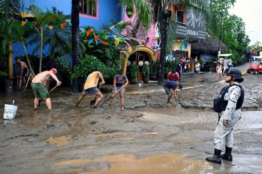 | Des habitants nettoient les rues après le passage de l'ouragan Roslyn, le 23 octobre à Sayulita dans l'État de Nayarit. |