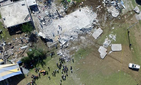 | Une vue aérienne montre les décombres laissés après une explosion qui s'est produite dans un entrepôt de feux d'artifice à San Isidro, Chilchotla, État de Puebla, le 9 mai |